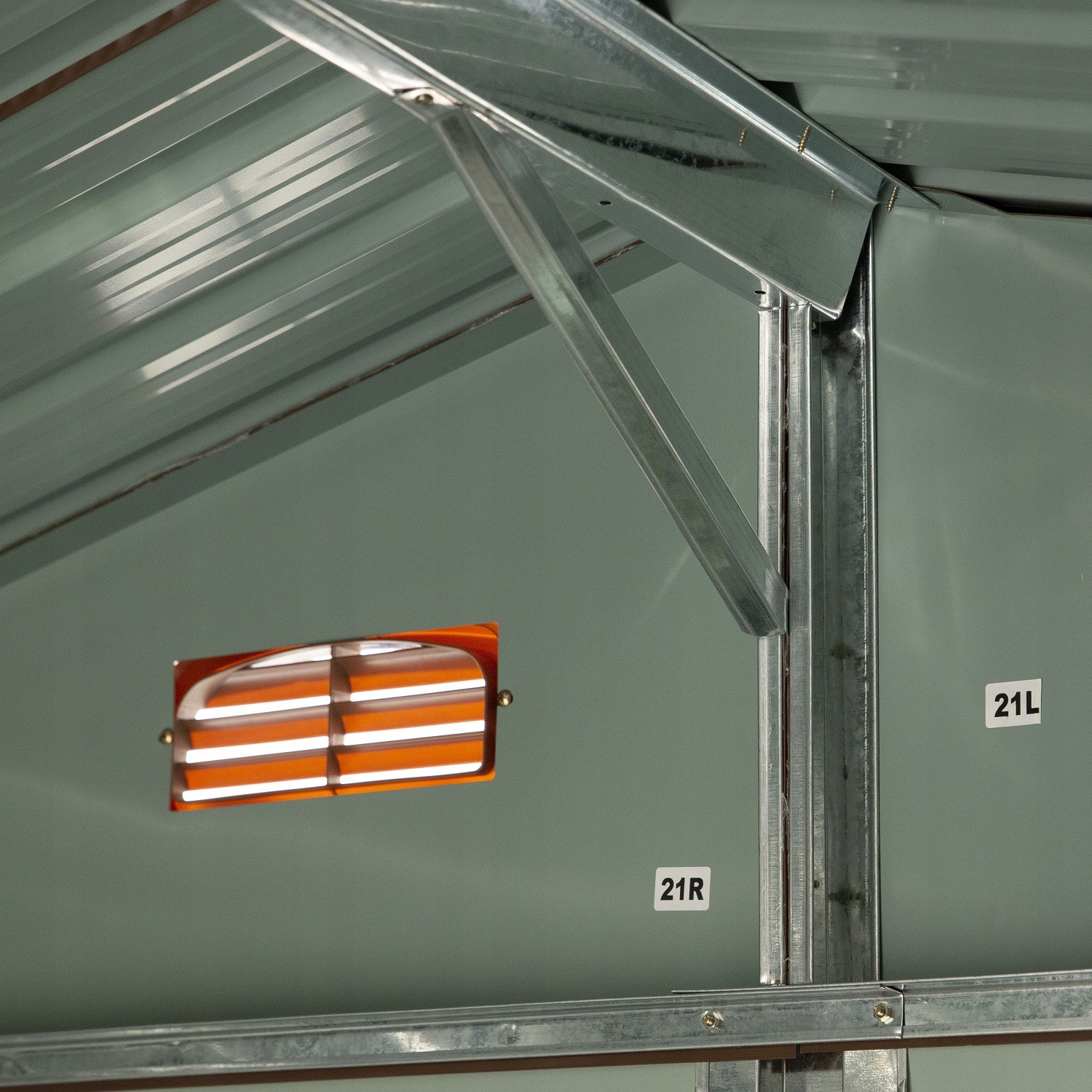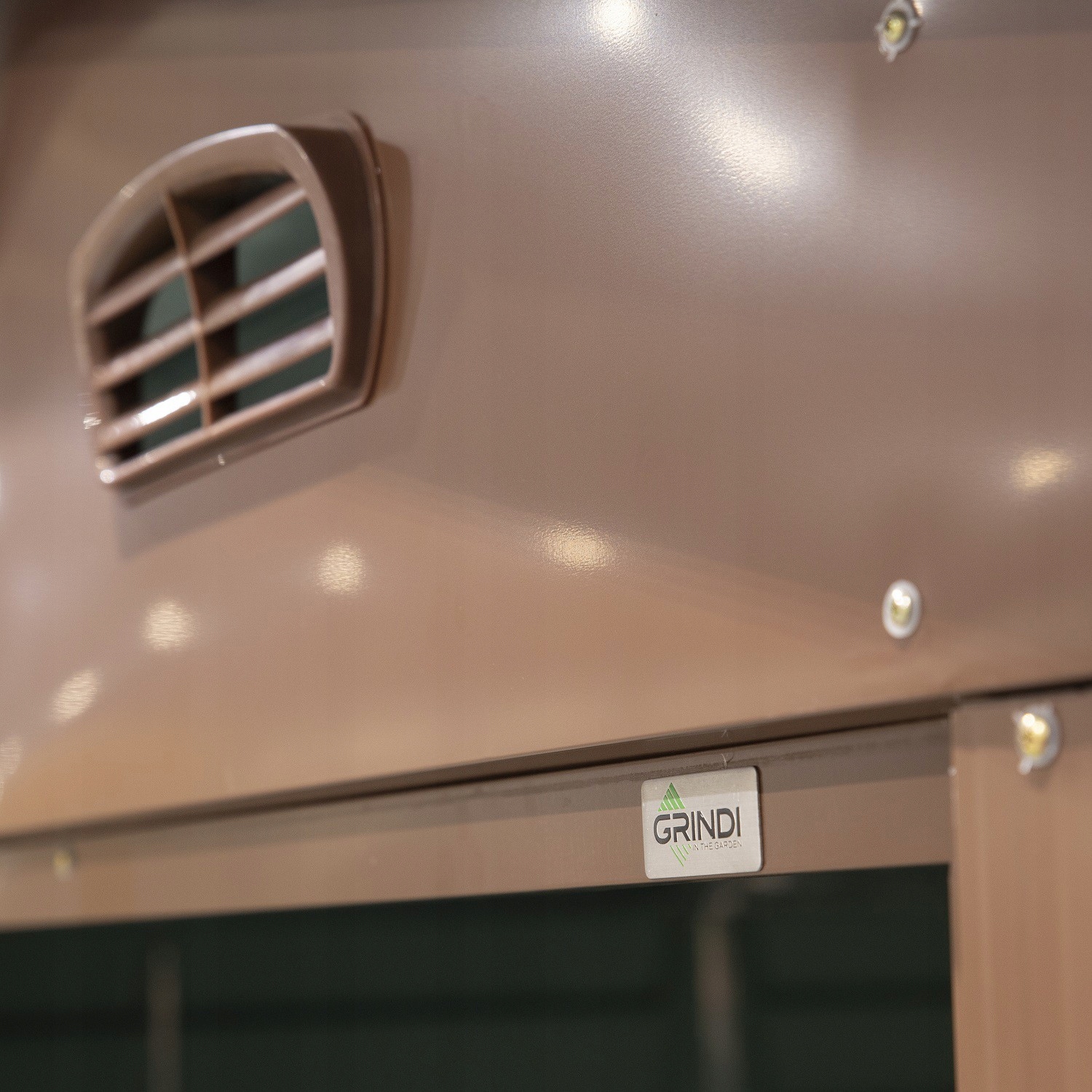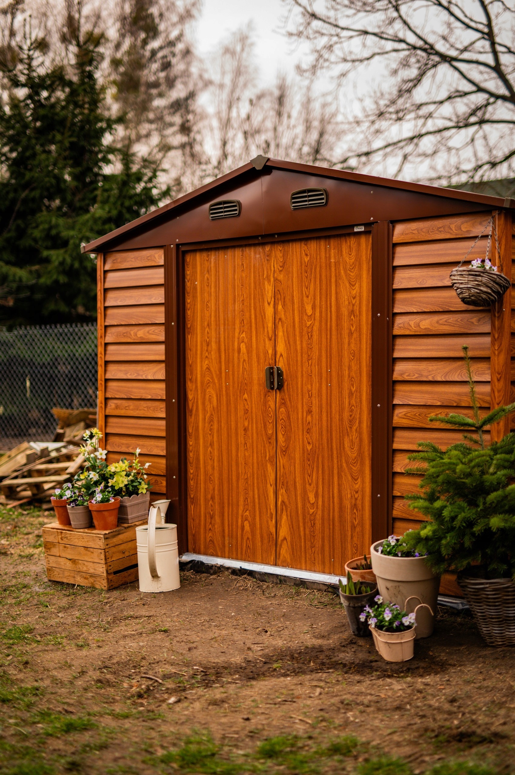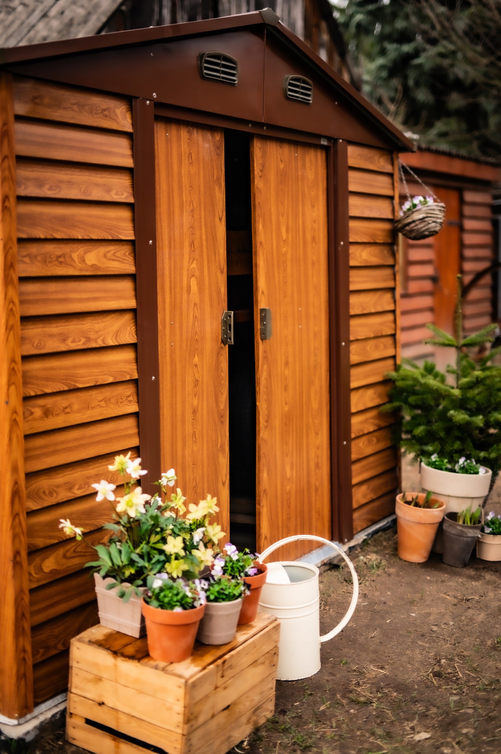 Dwa otwory wentylacyjne zapewniają dobrą cyrkulację powietrza. Szerokie przesuwne drzwi zapewniają łatwy dostęp do szopy.