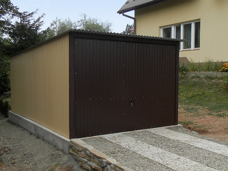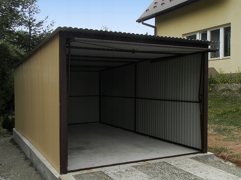 GARAŻ BLASZANY 3x5KOLOR PIASEK / BRĄZBRAMA UCHYLNADACH JEDNOSPADOWY NA TYŁo wymiarach szer. 3m x dł. 5m,z dachem jednospadowym na tył (wysokość frontu 2.15m, wysokość tyłu 1,90m),wyposażony w wygodną bramę uchylną do góry z zamkiem wkładkowym na płaski kluczyk i klamką w kolorze ral 8017 brąz,wykonany z blachy ocynkowanej powlekanej w kolorze ral 1002 – piasek,Poszycie dachu z blachy T14,konstrukcja wykonana z kątowników, ceowników i profili zamkniętych, pomalowana…