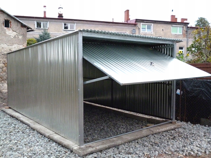 Garaż blaszany o wymiarach 3x5m z bramą podnoszoną do góry