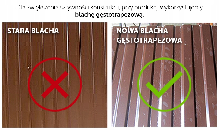Garaż wyposażony jest w bramę uchylną na sprężynach otwieraną do góry usytuowaną na środku lub po bokach. Brama posiada zamek z wkładką patentową oraz komplet kluczy. Nasze produkty wykonujemy z najlepszych materiałów dostępnych na runku. Jako nieliczni oferujemy wzmocnioną blachę gęstotrapezową bez dodatkowych opłat.