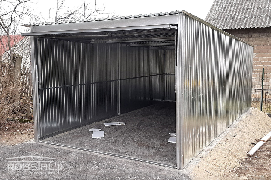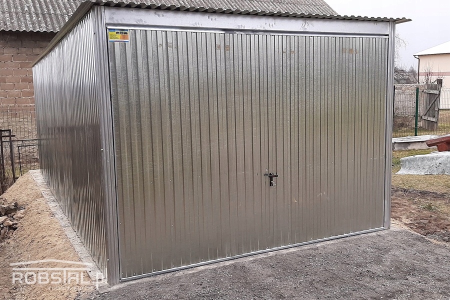 Ocynkowany garaż blaszany o wymiarach 3x5m z bramą uchylną na sprężynach. Konstrukcja garażu wykonana jest z kątowników ocynkowanych, do której przynitowana jest blacha trapezowa I gatunku ocynkowana ogniowo o zwiększonej odporności na warunki atmosferyczne.