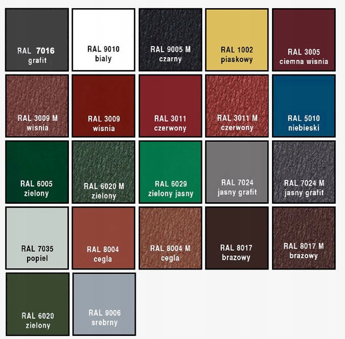 Prezentowane ponwyżej kolory blach z palety RAL połysk mogą się różnić od faktycznych ze względu na różne ustawienia kart graficznych i monitorów.