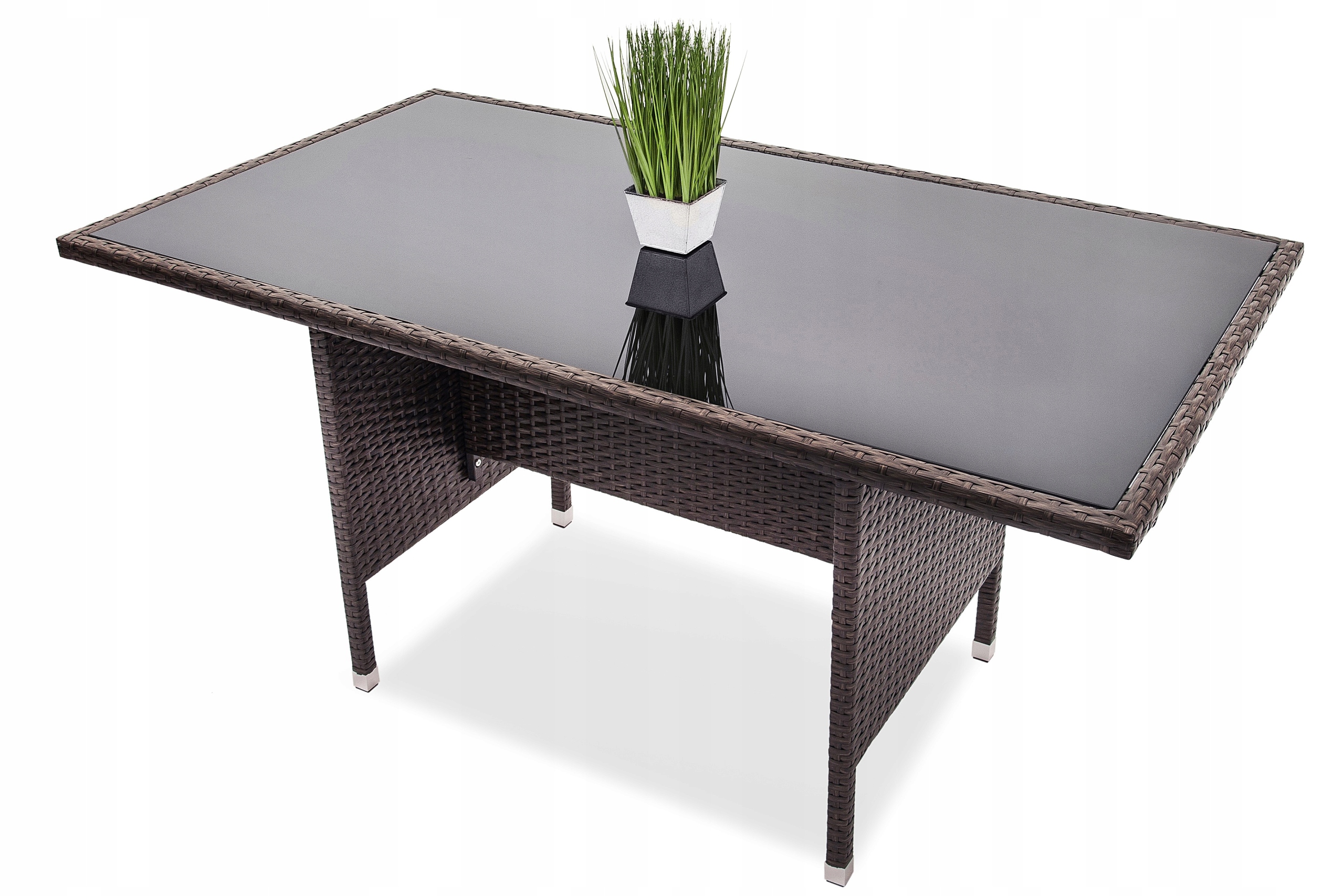 Każdy element posiada stalowe ramy oplecione technorattanem, dzięki czemu zestaw jest odporny na warunki atmosferyczne, a przy tym wygląda elegancko i przytulnie, a także posłuży Ci na długie lata. Blat stołu powstał ze szkła hartowanego o grubości 5 mm.