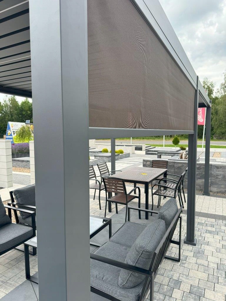 - Specjalnie zaprojektowany system odprowadzania wody rynnami do nóg pergoli
