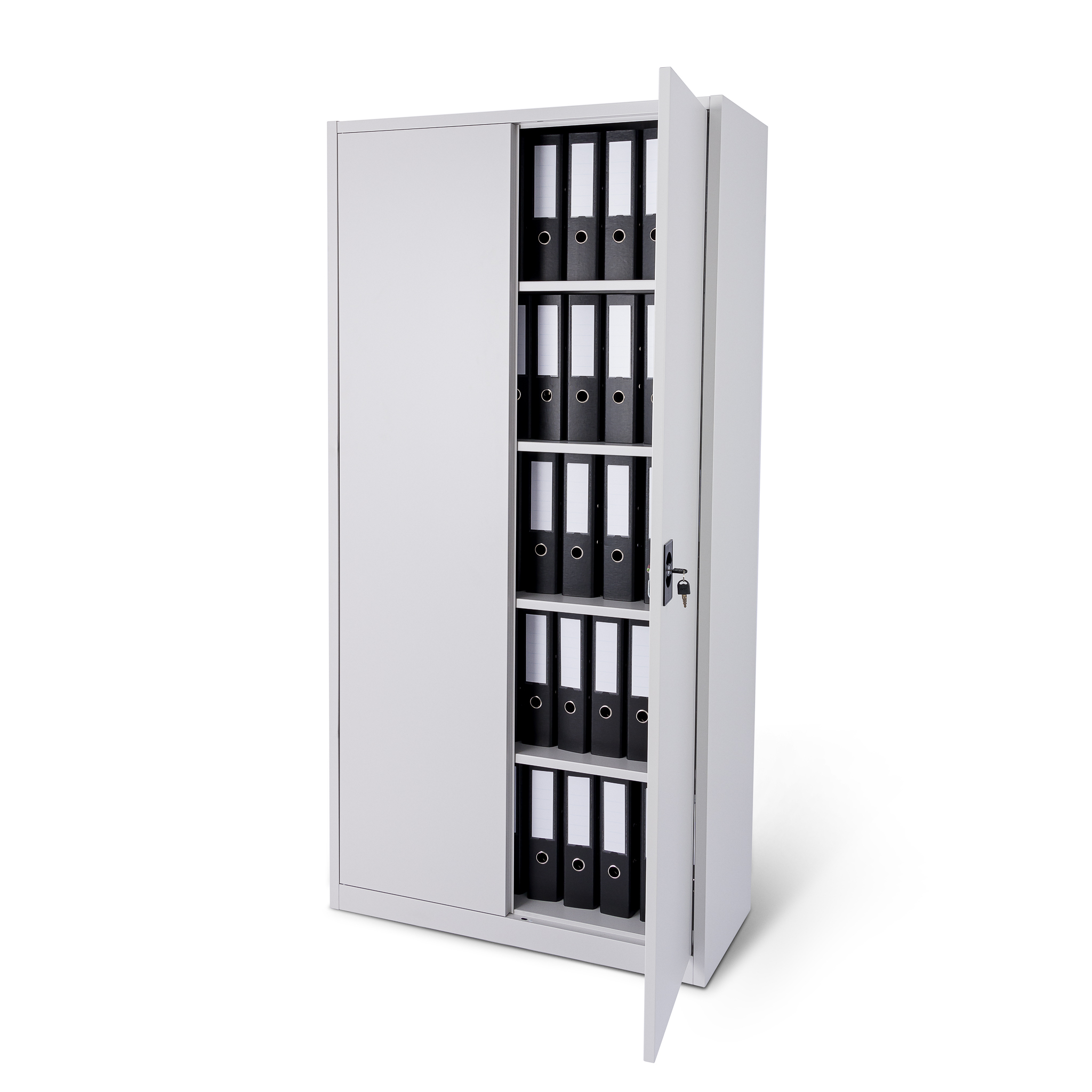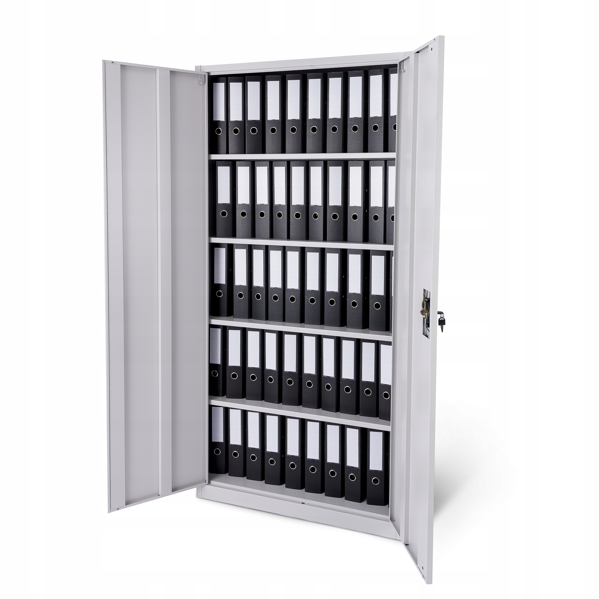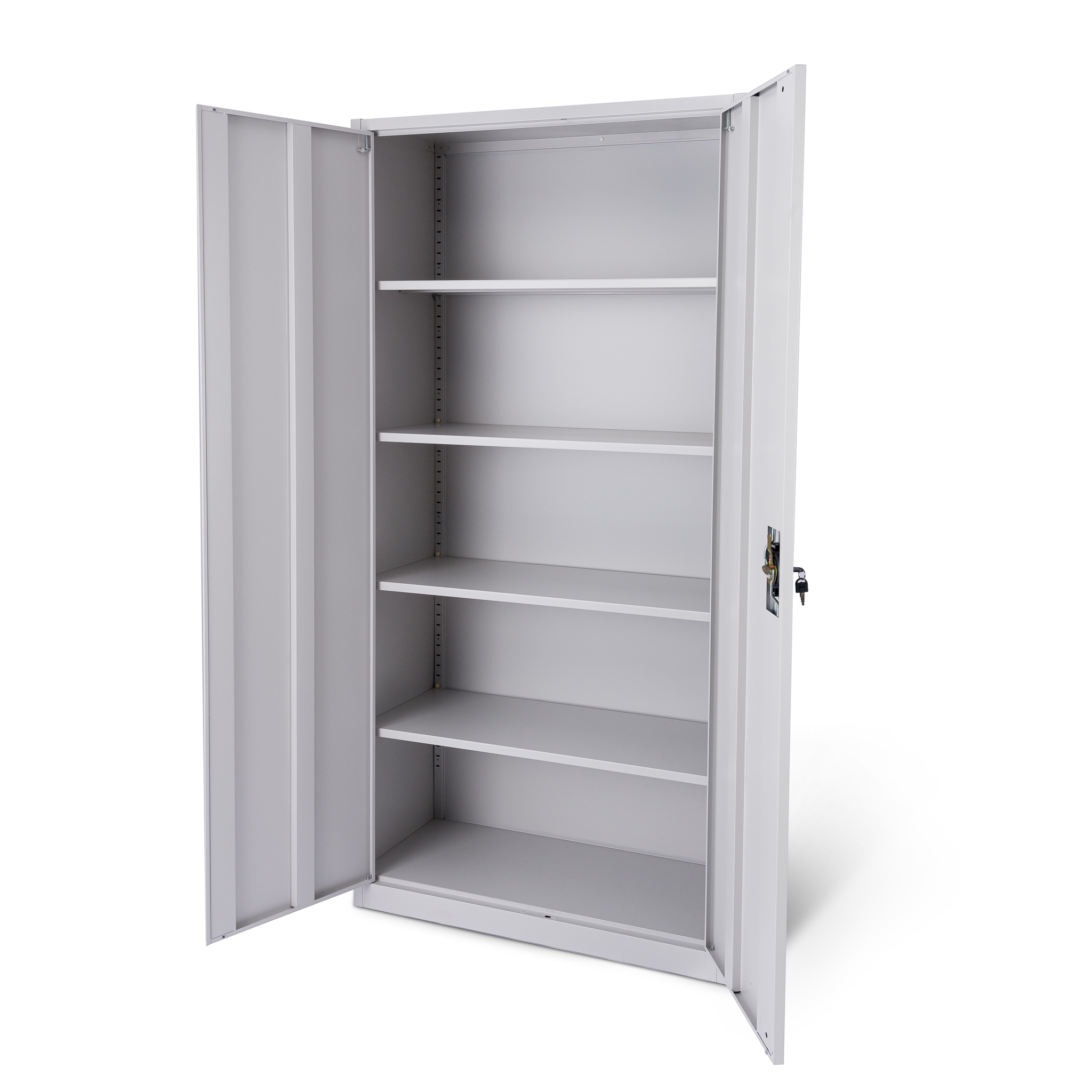 Szafa wyposażona jest w 4 stabilne półki. Każda półka może być obciążona ciężarem do 50 kg ( przy równomiernym rozłożeniu obciążenia ). Solidna i stabilna konstrukcja szafy w połączeniu z wysokiej jakości 3 punktowym zamkiem zapewniają ochronę przed dostępem nieuprawnionych osób.